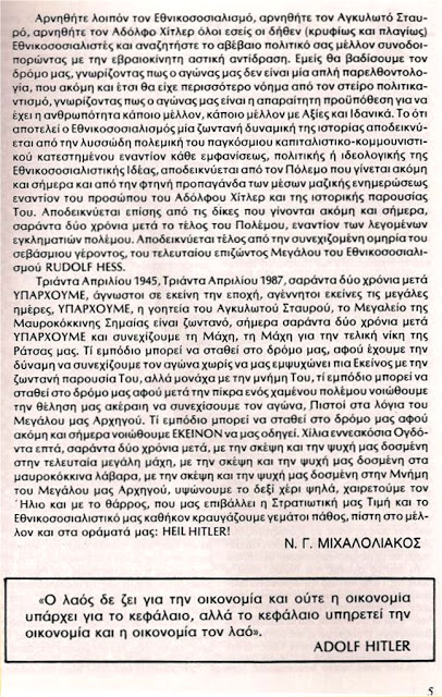 Ο ίδιος χαρακτηρίζει τον Χίτλερ «Μεγάλο Οραματιστή της Νέας Ευρώπης» και «Μεγάλο Αρχηγό» ενώ στον σφαγιαστή-αρχηγό των Ες Ες, Ρούντολφ Ες, που ζούσε τότε, αποδίδεται ο χαρακτηρισμός του σεβάσμιου γέροντα και του τελευταίου «Μεγάλου» του Εθνικοσοσιαλισμού. «ΥΠΑΡΧΟΥΜΕ», αναφέρει ο Ν. Μιχαλολιάκος σε ένα κρεσέντο ναζιστικής «υπερηφάνειας», «η γοητεία του Αγκυλωτού Σταυρού, το μεγαλείο της Μαυροκόκκινης Σημαίας είναι ζωντανό, σήμερα 42 χρόνια μετά συνεχίζουμε τη Μάχη για την τελική νίκη της Ράτσας μας?». Το κείμενο «κλείνει» με τον ναζιστικό χαιρετισμό γραμμένο στα γερμανικά «HEIL HITLER»!